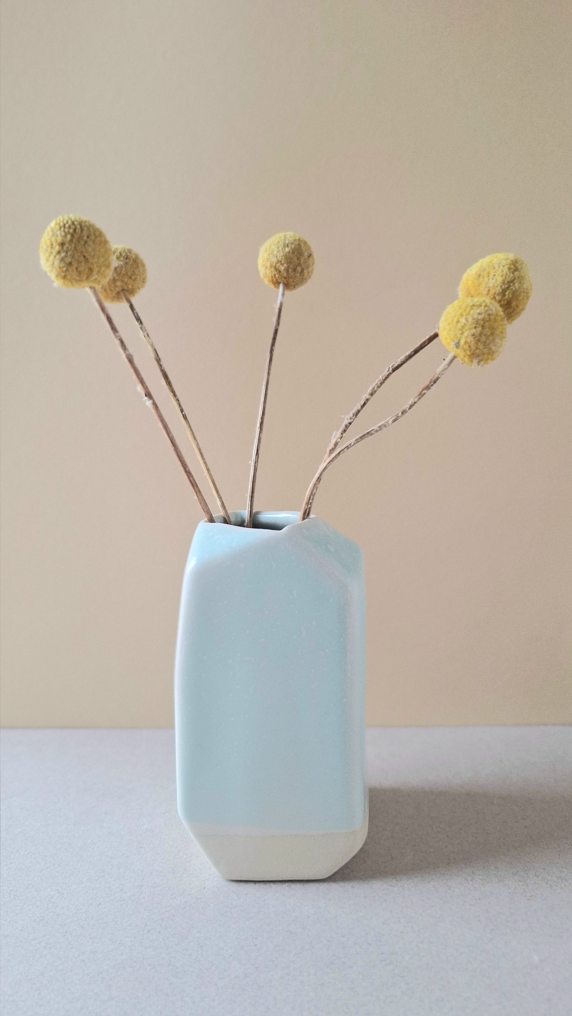 Distinctly faceted vase that can hold a whole bunch of flowers, but also looks great with just a stem or two. A sweet, smaller ceramic vase to decorate that perfect nook.