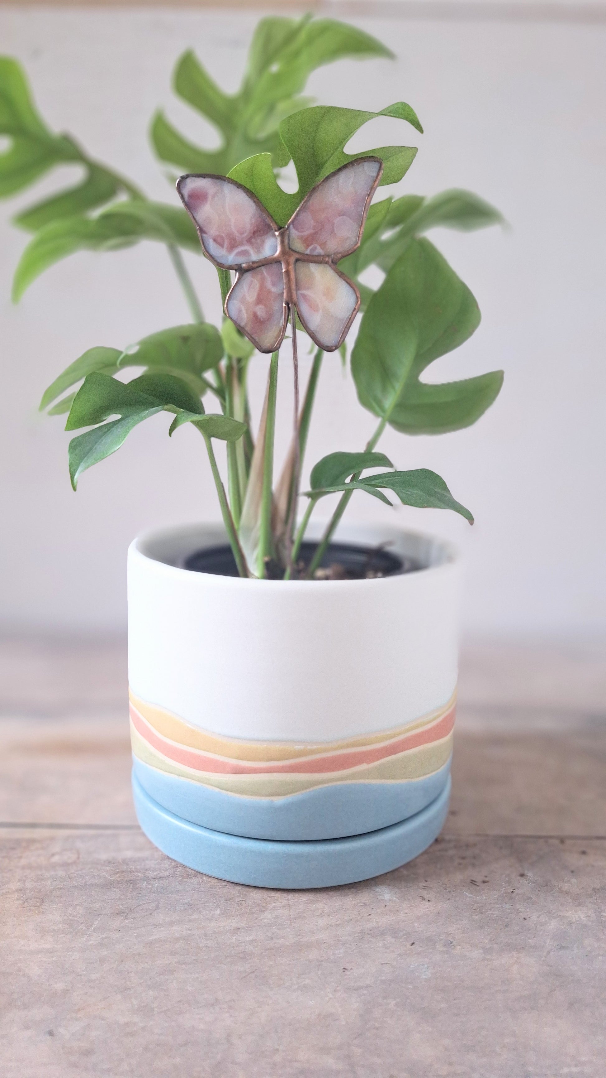 Bring the outdoor fauna inside with these stained glass butterfly plant stakes. Each is edged with a copper border to compliment the ethereal butterfly-ness of the textured glass.