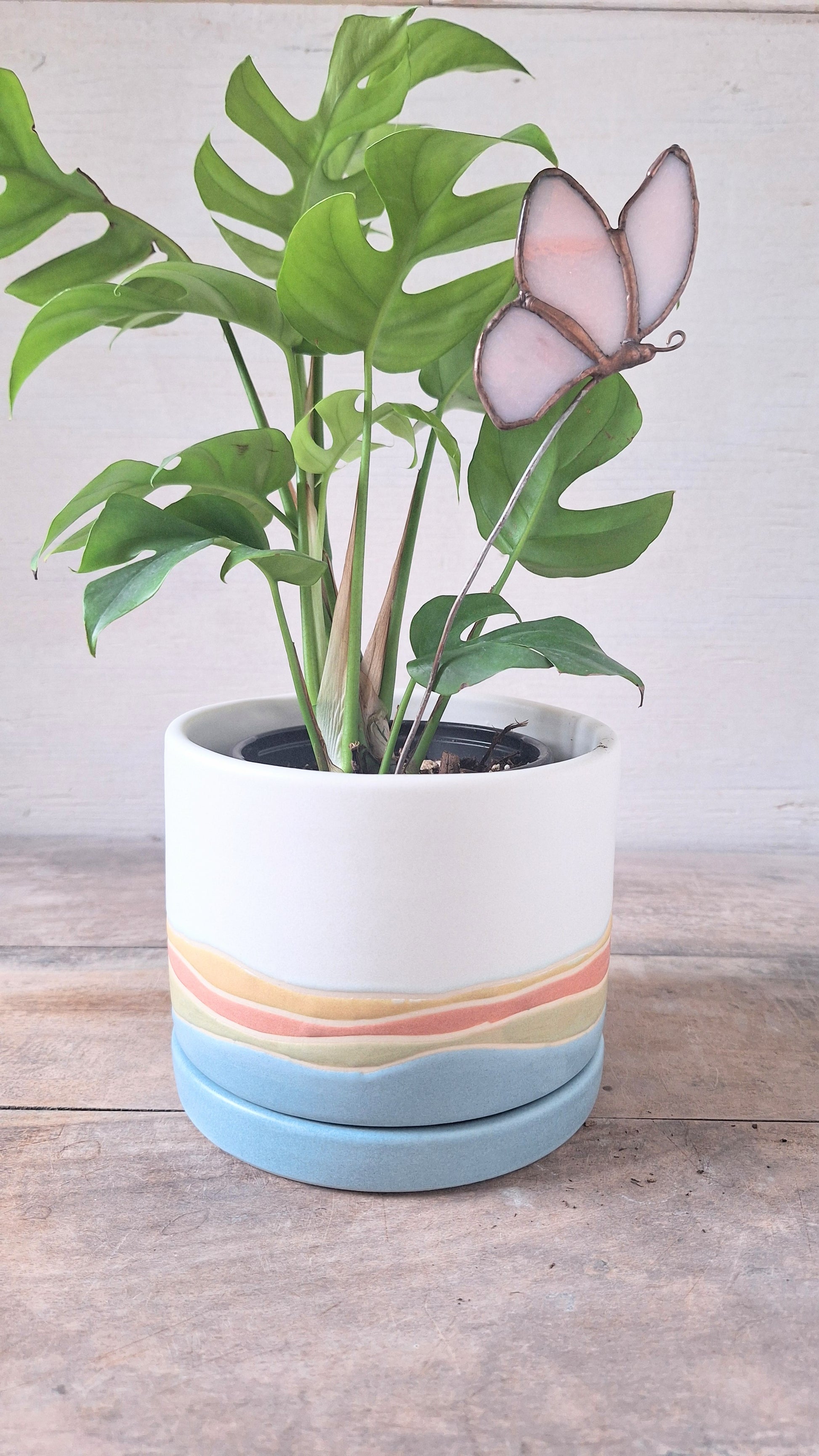 Bring the outdoor fauna inside with these stained glass butterfly plant stakes. Each is edged with a copper border to compliment the ethereal butterfly-ness of the textured glass.